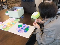 レクでは、青や紫色の折り紙を使ってはり絵をして