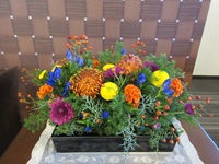 今回はピンクッション、スプレーマム、リンドウなど、原色のお花を使った色鮮やかなアレンジです。