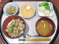 タレが甘めの豚丼をメインに、鮭が入ったお味噌汁なども。