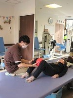 リハビリ用ベッドに横たわっていただき、ボールを足の間に挟んで
