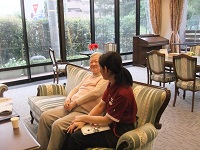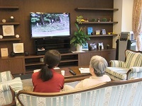 ラウンジにてゴルフ番組を熱心に見ている入居者様と、看護師さんの1コマです。