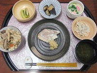 いろいろきのこの炊き込みごはん、赤魚の粕漬け、茶碗蒸し・・・