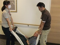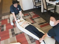 地震を想定し、車椅子の方を搬送をする練習を行いました。