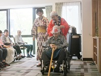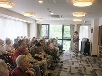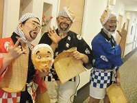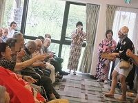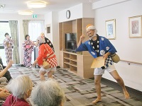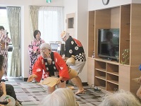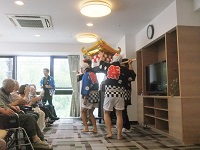 お祭の雰囲気を盛り上げました。入居者様もいっしょに声を出して手を叩き