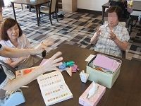 おやつの前の時間を使って、歌や手作業などのレクを毎日行っています。