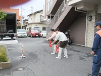 その後、屋外で消火訓練を消防署の方にご指導いただきながら行いました。