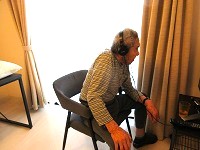 部屋にお邪魔すると、大きなヘッドホンをつけて