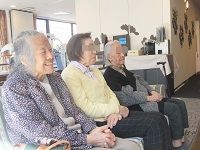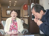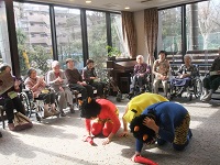 スタッフがハーモニカで曲を吹きながら、数名の方々と一緒に