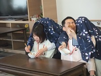 あつあつのおでんとケーキを、後ろにかぶさっている人が