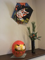 飾りました。ディスプレイコーナーには凧やだるまなど