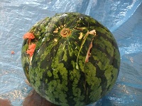 今回のスイカはとても大きく頑丈で、なかなか割れ目ができなかった