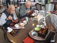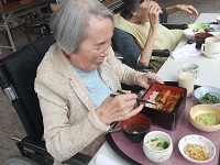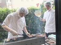 一階のラウンジに集まって頂き、目の前でうなぎを焼きました。