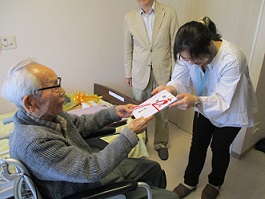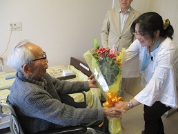 内閣総理大臣より、百歳の高齢者のお祝い状及び記念品の贈呈が行われました。表彰状や記念品、花束にびっくりされると同時に、とても喜んでいらっしゃいました。