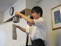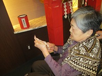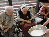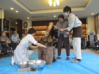 男性の入居者様はわりと力があるので、無理のない範囲で餅つきを体験して