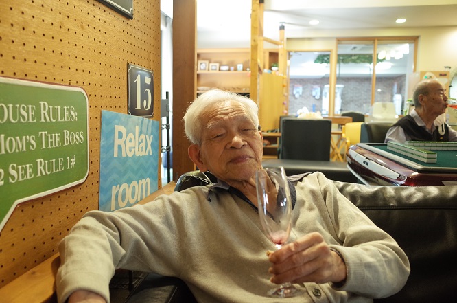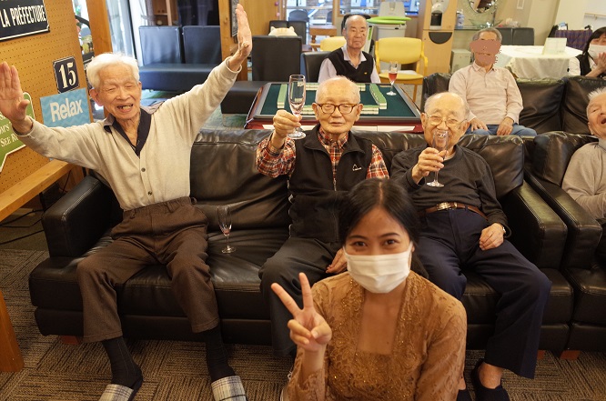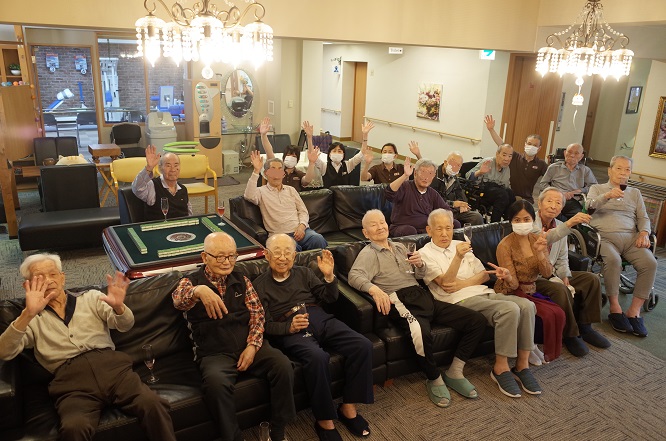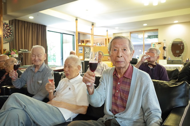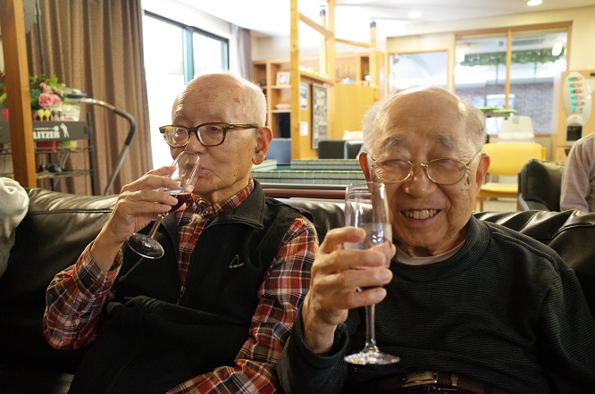 利用者様みんなでシャンパン(ノンアルコール)で乾杯をして