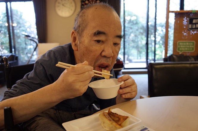 私たちの介助ではなく自らの力で、4種の餃子を見事完食