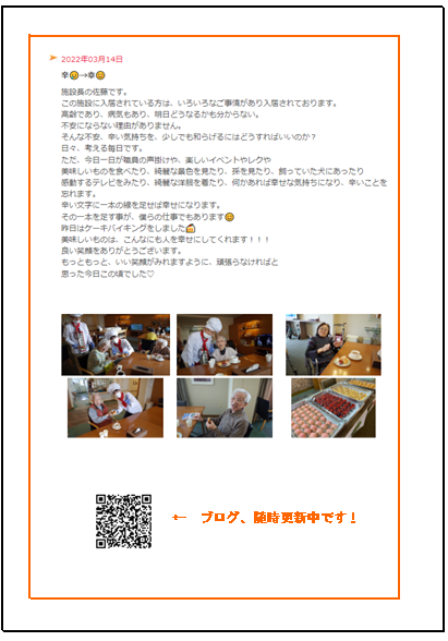 施設長から「ブログを載せた営業資料を作って~」とリクエストを受けたので、さっそく作ってみました。
