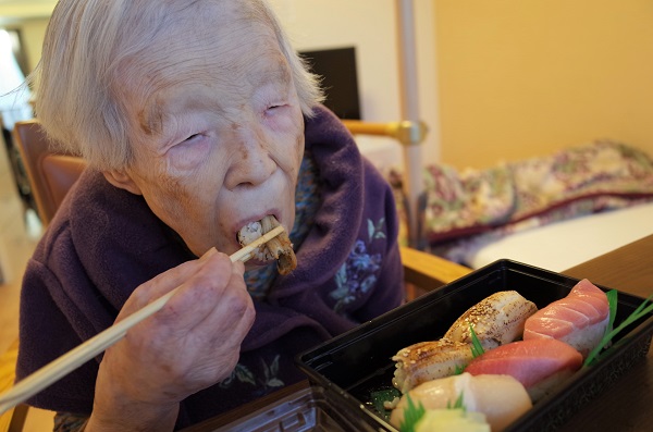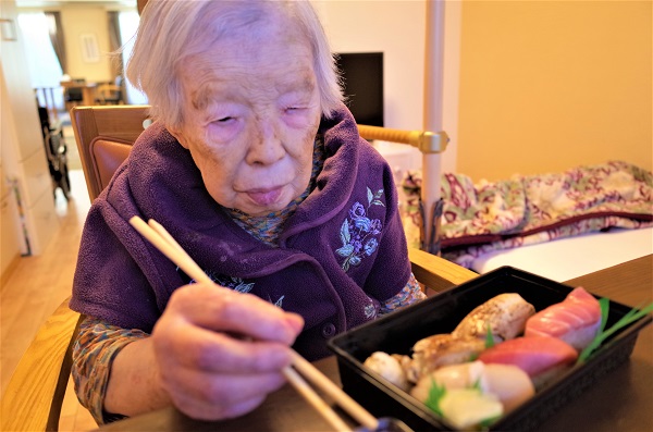 と前向きな姿勢でお寿司を召し上がり始めたS様ですが、お箸を持つ手がちょっと辛そう。