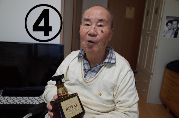 ④夕方4時過ぎ、嬉しそうにウイスキーを抱えるY様です。「今から晩酌だよ」とのこと。