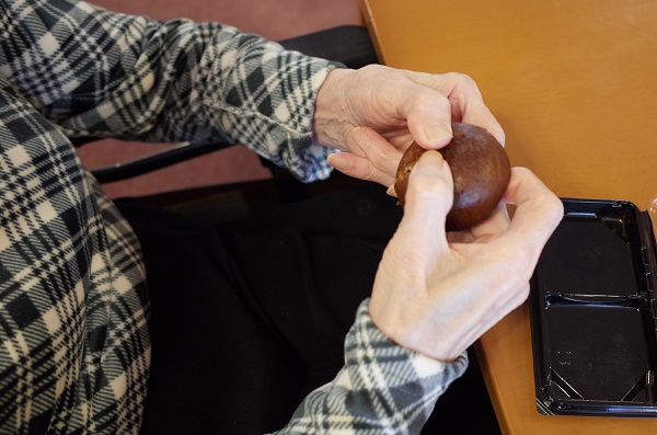 Y様はお隣に座っていらっしゃるT様に「どうぞ」とお饅頭を差し出しました。