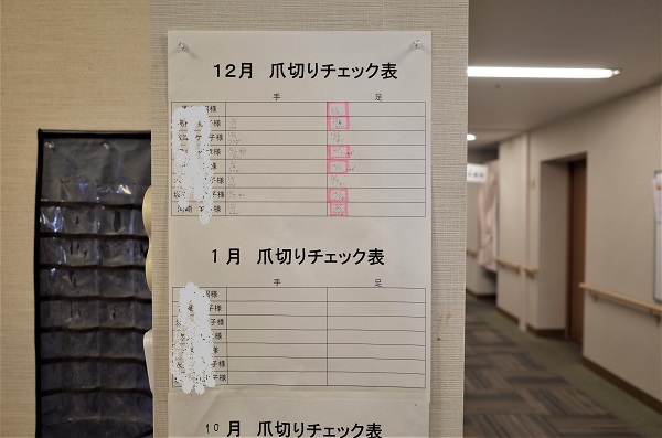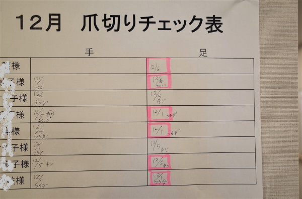 4枚目・5枚目の写真は毎月更新している爪切りチェック表なのですが、1階のチェック表に関しては