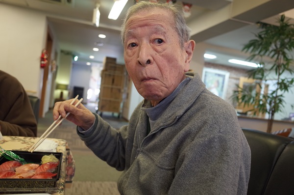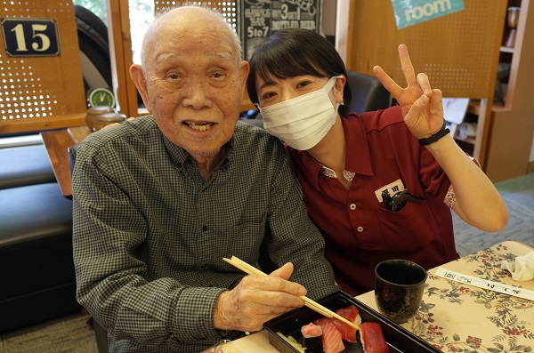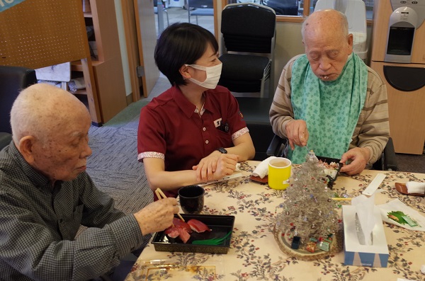 今日は4名の入居者様にお集まりいただいたのですが、皆さま夢中でお寿司を召し上がっていました。