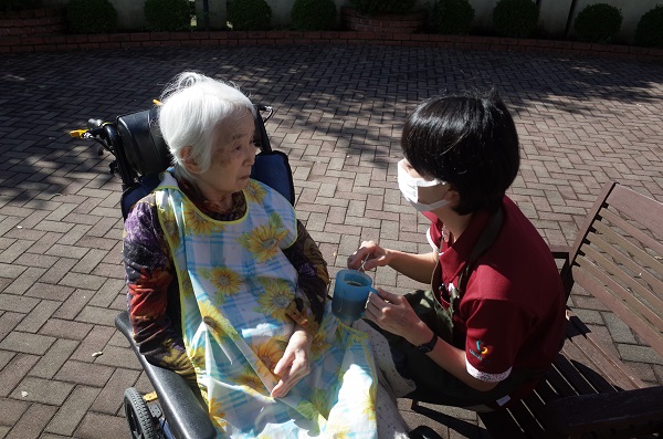 それでも今日の昼食はとても表情が良かったので、気分転換も兼ねて庭でのお食事にチャレンジしてみました。