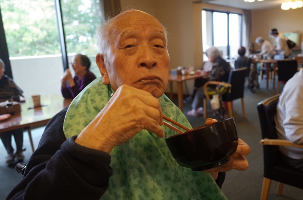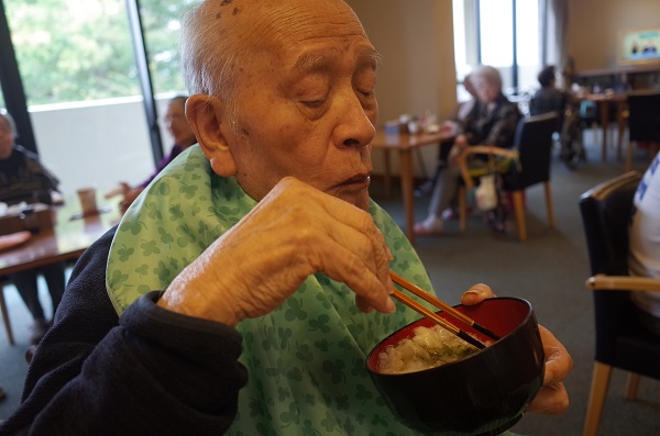 お食事が配膳される時間ぎりぎりにベッドから離床していただき、体力があるうちにお食事を召し上がれるよう工夫しています。