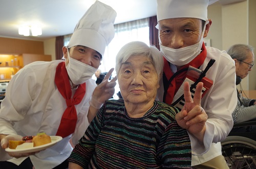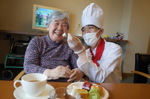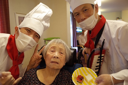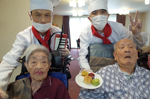 3階➡2階➡1階と順番に佐藤施設長と音楽隊員南波介護士がスイーツを運んで利用者様に選んでもらうシステムに