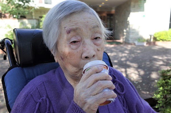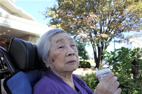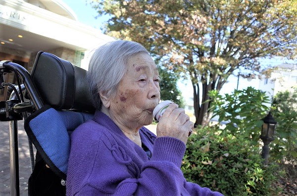 1階に降りてから「お庭でジュースも飲んでいただこう」と気づいたので、私がジュースを取りに行っているあいだ施設長と一緒に事務所前で待っていてもらいました😊
