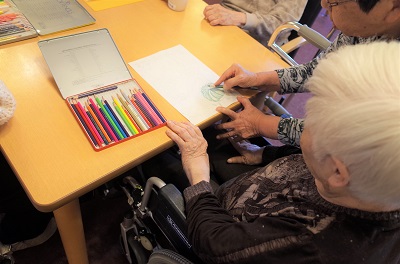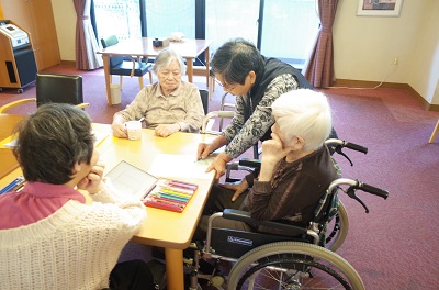 あ、U様まだ時々手が止まっちゃうから大丈夫かな・・・と気になってもう一度様子を見に行くと、2階の入居者様がU様の周りに集まって塗り絵をお手伝いしてくれていました。