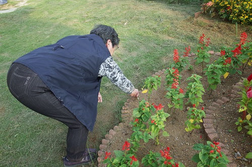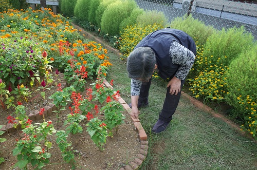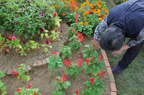 公園に着いたH様。「綺麗なお花ねぇ。」と仰ったと思ったら、じーっと花壇を見て一言。
