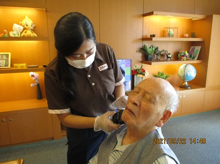 朝ひげを剃ったはずが気になってしまい再度髭剃りをする利用者様♪