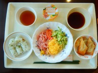 今日の昼食は冷し中華でした✨ハム、錦糸卵、きゅうり、トマトが乗っており酢醬油ベースの掛け汁がかかっていました(^^)/よく冷えて、喉ごしもツルツルとしていてとても美味しかったです✨