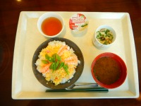 今日の昼食はちらし寿司でした✿玉子、桜でんぶ、エビ、サヤエンドウ等がのっていて、見た目がとても鮮やかでした。味もさっぱりしていて美味しく、赤だしと相性が良かったです。入居者様もちらし寿司の日は皆様とても喜んで召し上がられています(^^)