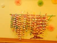 壁一面に4月のかわいい飾りつけを残し、5月の飾り付けとして、色紙と画用紙で「藤の花」を作りました。「花」の部分は入居者様にも手伝っていただきました(^^)「なにこれ?」という声もスタッフ、入居者様共にありましたが、「藤の花です」と答えると、皆様「綺麗だねぇ~」「いいねぇ」等、お褒めの言葉を頂いています\(^o^)/