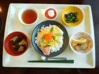 今日は母の日という事で、ちらし寿司が出ました。カニ、錦糸卵、さやえんどうが入っていて、上にはイクラがのっていました。見た目が華やかで春らしく、味はさっぱりしていて美味しかったです(^^)菜の花のおろし和えは大根おろしと柚子で和えてあり、菜の花のほのかな苦味によく合っていました。ささみの梅しそ巻き、若竹汁と、今日はとても春らしく満足でした(^v^)
