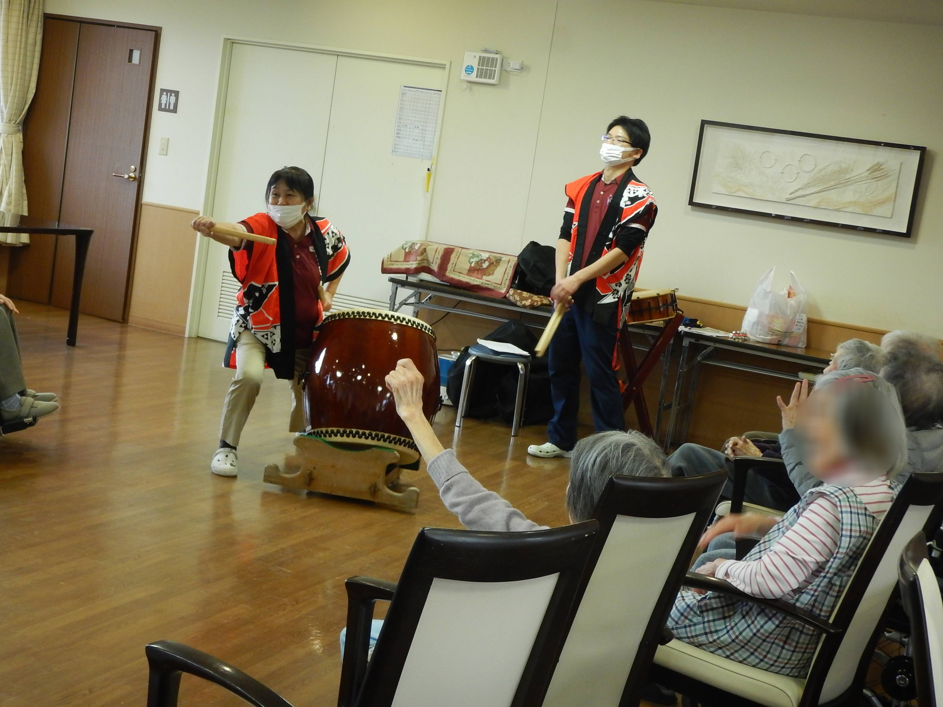 入居者様が順番に太鼓体験していたり