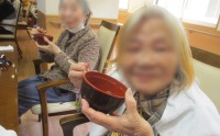 二人羽織の後は体操をして、抹茶とぜんざいを提供すると