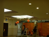 スタッフがそれぞれの役割分担で、梯子に上って天井の装飾をする者、壁やエレベーター横を装飾する者、