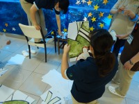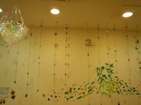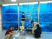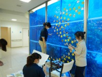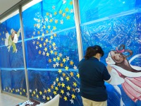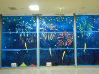 中庭の見えるガラス窓に、下地に透明のブルーシート。そして、金色・銀色・黄色の星型☆を切り取り、