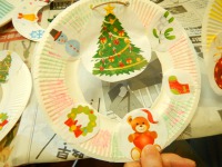 紙皿に、色を塗ったり、クリスマスのオーナメントや、サンタ、トナカイのイラスト、