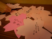 桜の形の画用紙に春や、桜についての思い出や、言葉を入居者様に書いて頂き、壁に貼り、大きな桜の木に花が沢山咲きました。