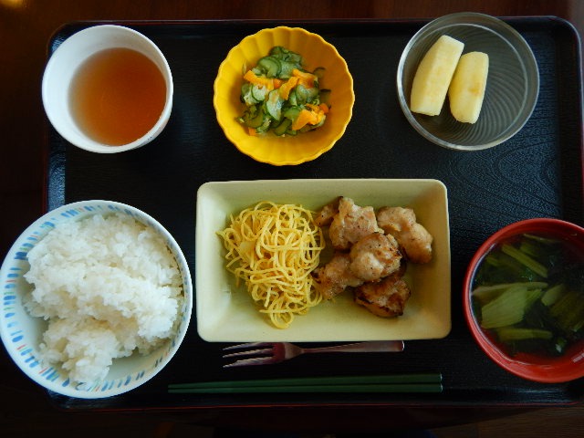今日の昼食は炭火焼チキンでした✨肉はとても柔らかく、ジューシーで炭火で焼いた際の香ばしい風味が口いっぱいに広がり、普段と少し違った調理法の為、新鮮さが感じられました🙆スパゲッティーもカレー風味で食が進みました✨サラダはきゅうり・パプリカ・タマネギをドレッシングで和えてさっぱりした味でした👨
