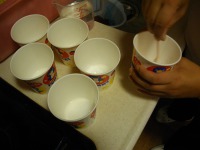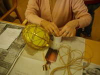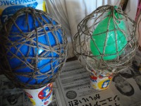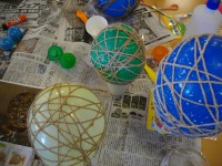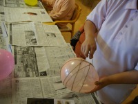 ボンドと水を1:1で混ぜ合わせ、その中に麻ヒモを浸して風船に巻きつけていきますが、巻きはじめは麻ヒモがツルツルとすべってしまい、すごく巻きにくく、皆さん大奮闘されていました!