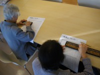 スタッフが2ケタ・3ケタの数字を読み上げ、入居者様がそろばんの珠をはじきますが、皆さん真剣に取り組まれ、静かな空間に珠をはじく音が響いていました。