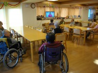 皆さん百歳体操のDVDを見ながら「1・・2・・3・・4・・」と、ゆっくりと音楽に合わせて手や足や腰など身体を動かしておられました。