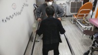 リハビリ室内で、平行棒を使って下肢筋力低下予防の練習中です。