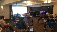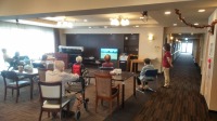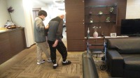 リハビリ社員が横に付き添いながら、1階ラウンジのソファー周囲を