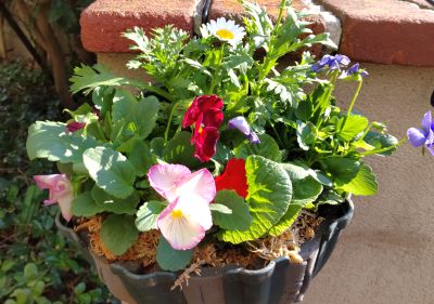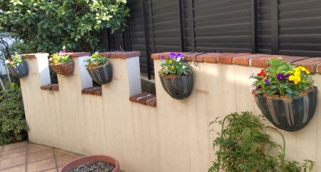 1つのバスケットに花苗を5つずつ入れこみます。土と土の間に隙間なく土を埋め込むのがポイント。長持ちの秘訣だとか。